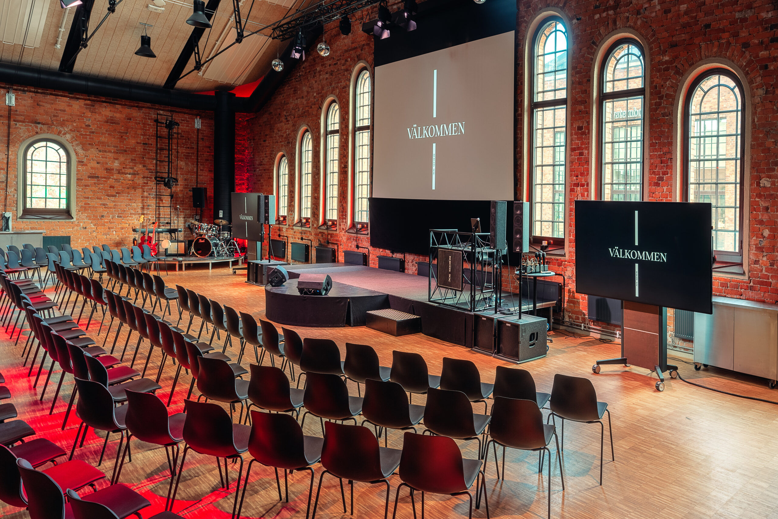 Allt från galamiddag, företagsfest eller AW. Aulan rymmer allt: scen för framträdanden, barer för mingel och middagsdukning för upp till 200 personer. Kombinera ljus, ljud och smak till en helhetsupplevelse.